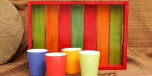 Theme :Hand Painted Multicolored Wooden Tray with 4 Ceramic Glasses