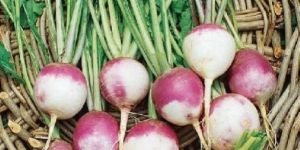 Large rooted, heavy yielding variety, roots are round, smooth, bright purple red upper part whereas lower portion is creamy. Flesh is white, firm crispy and mildly sweet flavored.