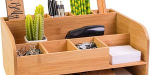 Features Eco-friendly from 100% sustainable bambooproduct Stylish Gives your desk a natural companion Ideal eco-friendly gift Each Bamboo desk organizers handcrafted from carefully selected stems of bamboo.