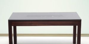 Modernize your dining room with this glass topped dining table by Ekbote. This solid wood structure can seat six people and is made of the finest quality. The glass surface combines both utility and class into a single package. Beneath the glass top, there is a rectangular slot which houses medium sized pebbles from the riverbed. The glass is easy to clean and forms the perfect contrast with the dark wood. Transform your dining experience with this well designed table.