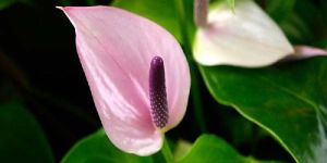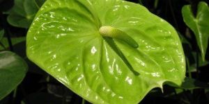 Anthurium/Flamingo-lily/Flamingo Flower/Oilcloth-flower/Tail Flowers are finger-like or tail-like spadix above a very shiny, waxy, colorful, heart-shaped spathe.The leaves are large, glossy dark green oblong-heart-shaped to arrow-shaped.