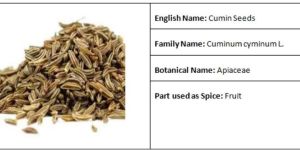 cumin seeds are extensively used in mixed spices and for flavoring curries, soups, sausages, bread and cakes. In herbal medicine, the seeds cumin are considered to be a traditional medicine. It has is classified as stimulant, carminative, and antimicrobial. They are considered beneficial for the digestive system. Cumin seeds consist of moisture 6.2 percent, protein 17.7 percent, fat 23.8 percent, crude fiber 9.1 percent, carbohydrates 35.5 percent and mineral matter 7.7 percent per 100 grams. Their mineral and vitamin contents are calcium, iron, phosphorous, potassium, thiamine, sodium, riboflavin, niacin, vitamin c and a.