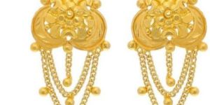Express your love for traditional jewellery every day with these lightweight yet meticulously crafted 22k gold earrings. The floral motif in the centre and dangling gold strands with rezi balls will add to your feminine charm.