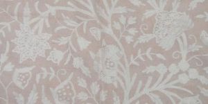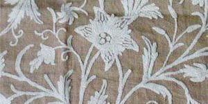 • By the yard Crewel Fabric, Hand-Embroidered in traditional patterns by Kashmiri craftsmen. Shown here is Crewel Embroidered Fabric in the Tree of Life design, Beige Jute Background, Off-White Wool Embroidery.   Due to the nature of crewel work, there are inherent issues that are unavoidable and do not carry the same guarantee as machine embroidered fabrics.Handcrafted in Kashmir using age old embroidery techniques, crewel work is indigenous to this region only.Each piece of fabric is unique, as different groups of workers are employed for each piece.Every care is taken to maintain a consistent yarn color & embroidery pattern, however it is not practically possible to maintain perfect matches. There may also be missing yarns / slight staining. This is deemed normal.