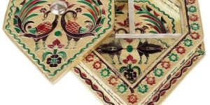We offer diamond shaped, flower designed hand-made meenakari decorative platter. Item code : lc-db-11 g.m. Diamond shaped, flower designed hand-made meenakari decorative platter dry-fruit box chocolate box mouth-freshener box - g.m. (7" x 8" x 1.5" inches) elegant and long-lasting gift for all occasions item size (lxbxh) : 7" x 8" x 1.5" inches item weight : 515 grams inner compartment : 3 opening style : knob inner material : molded fiber mdf outer material : golden aluminium sheet decorated by : meenakari (colored wax) ideal choice for : dry-fruit box, rakhi box, modak box, puja box, bridal marriage box, groom marriage box, chocolate box, mouth-freshener box, sweet (mithai) box, gift (shagun) box, pan box, etc. Note : handicraft items are prone to +- 5% variation in size and weight.