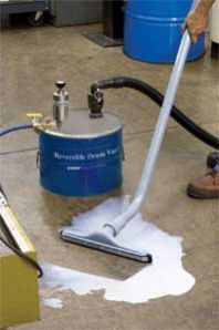 EXAIR's compressed air operated Reversible Drum Vac System attaches quickly to any closed head 30, 55 or 110 gallon drum. Its high powered vacuum fills a 55 gallon drum in less than two minutes. With the simple turn of a knob, the same stainles steel pump quickly empties the drum. Coolant sumps can be easily refilled, floor spills vacuumed, or contaminated liquids transferred to filtration tanks in minutes. The flow rate in and out of the drum can be controlled with the knob, making it ideal for dispensing liquids.