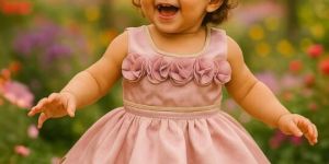 Give your baby girl a fairy-tale look with this onion pink frock for girls. Featuring charming 3D floral embellishments along the neckline and a beautifully laser-cut hemline, this sleeveless girls frock is both elegant and adorable. Made from soft satin fabric for all-day comfort, it’s perfect for birthdays, family gatherings, and photo sessions.