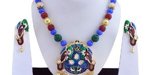 Amplify your indian look with this amazing piece of necklace set that comes with matching earrings from the house of mk jewellers and look absolutely stunning. Made of the best quality material this completes your look.this beautiful meenakari necklace is baesd on a round and red elephant temple embellished pendant with delicate handwork of meenakari and kundan stones the rest of the string of necklace is decorated using meenakari / enameled balls, cutting solid color balls and golden separators. The earrings are based on meenakari / enameled balls crowned using cutting solid color balls.it will fetch you endless compliments for your traditional choice.