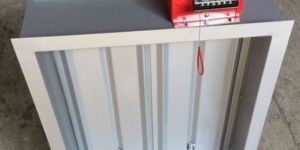 GI sheet construction fire & smoke dampers with flat V type opposed blade operation, 16 swg G.I. blade 150mm wide, 16 swg G.I. frame 165mm wide, chrome plated spindle, self lubricating bronze bushes, blade. Linkage fully enclosed, stainless steel side seal gaskets on the sides.