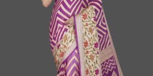 "Elevate your elegance with our stunning Banarasi saree, where the timeless blend of purple and white weaves a tale of grace and sophistication."
