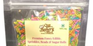 Ingredients: Sugar,Edible Vegetable Fat,Milk Solids,Maize Starch & Permitted Preservatives and Flavour Perfect for decorating your cakes, cupcakes, cookies, brownies, ice-cream, sundaes and more Sprinkles are very small pieces of confectionery used as a decoration or to add texture to desserts such as brownies, cupcakes, doughnuts or ice cream. Sprinkles generally require frosting, ice cream, or some other sort of sticky material in order to stick to the desired food surface. They can be most commonly found on smaller confections such as cupcakes or frosted sugar cookies, as these generally have more frosting and smaller diameter than do cakes. Add a dash of colourful sparkle by dunking your ice-creams, Fro-yo 's, Cake pops, Cakes, Muffins etc.